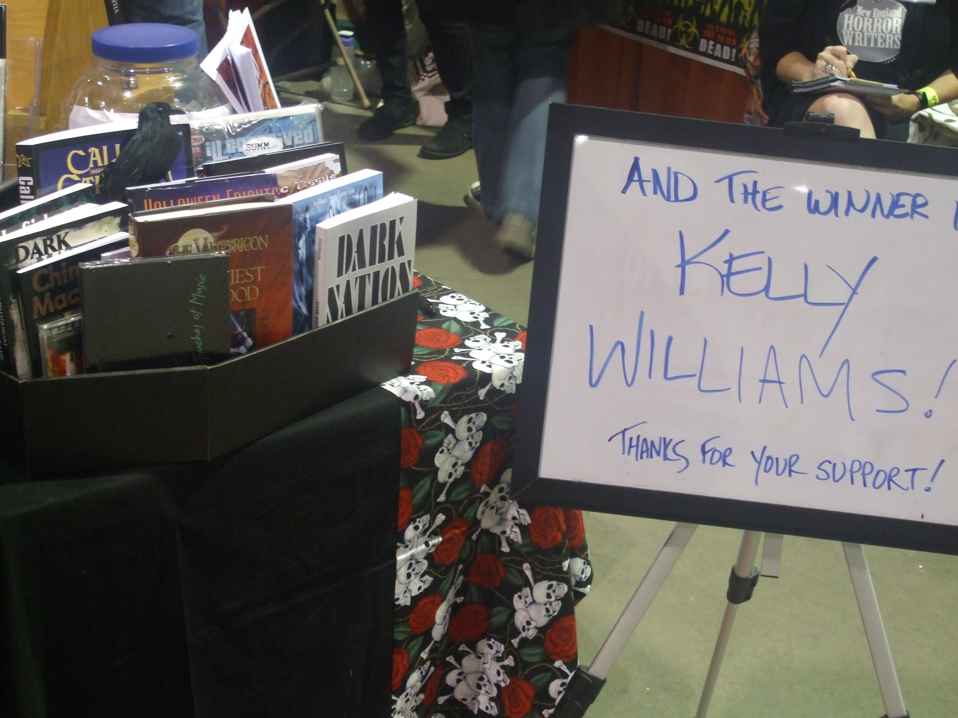 The NEHW booth had a raffle and the prize was a coffin full of books. A coffin looking box, not an actual coffin. The winner was Kelly Williams, of Enfield, Connecticut. Her name was drawn out of the raffle container Sunday afternoon.