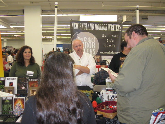There were other writers as well, most notably a contingent of the New England Horror Writers. Rob Smales, one of those selling books with the group, said that there were “a metric butt-ton of good writers in the New England area– some seriously creative people.” Earlier in the day, he’d gone around the event with a death mask on to scare up some business.
