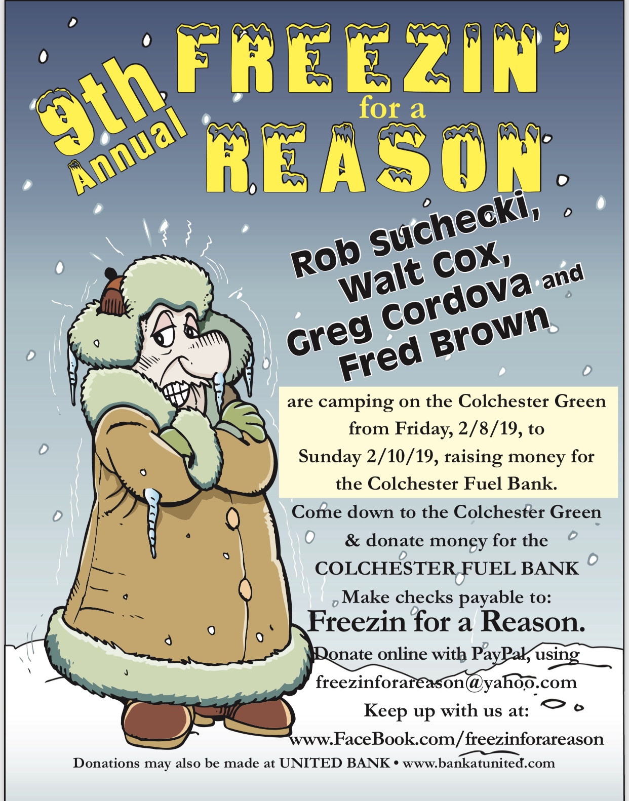 Please visit the 2019 Freezin’ for a Reason fundraiser on the Colchester Town Green from 2:00 pm Friday, Feb. 8 to noon on Sunday, Feb. 10 and drop a few dollars into their bucket. If you can’t make it to the Green, visit any United Bank location and deposit to their (Freezin’ for a Reason) account. If you can’t do that, please use PayPal and use the email address freezinforareason@yahoo.com to donate.