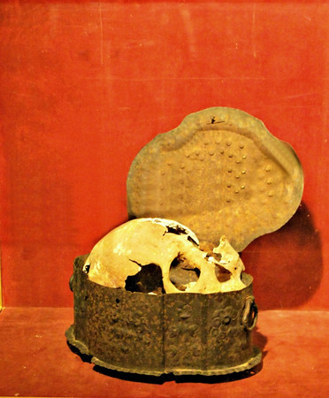 One of the most treasured items that was kept in the Burmese Manuscript Box was given to Hammond, Jr. by the Governor of Santo Domingo – the purported skull of one of Christopher Columbus’ crew members. The oval box that the skull is resting in is of the late-14th or 15th century design; both were kept in the Burmese box at night and highly valued by Hammond, Jr. as he considered himself to be a world class explorer much like Columbus and his ilk.