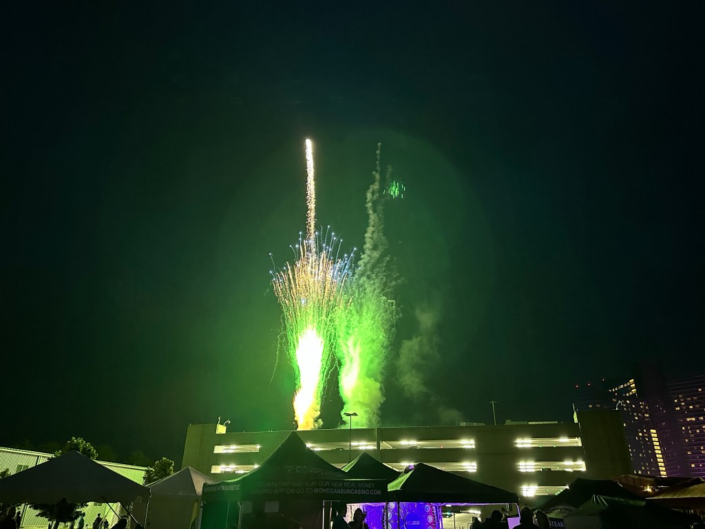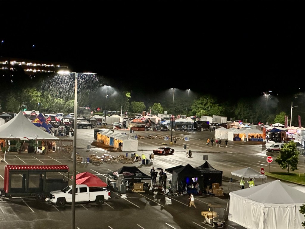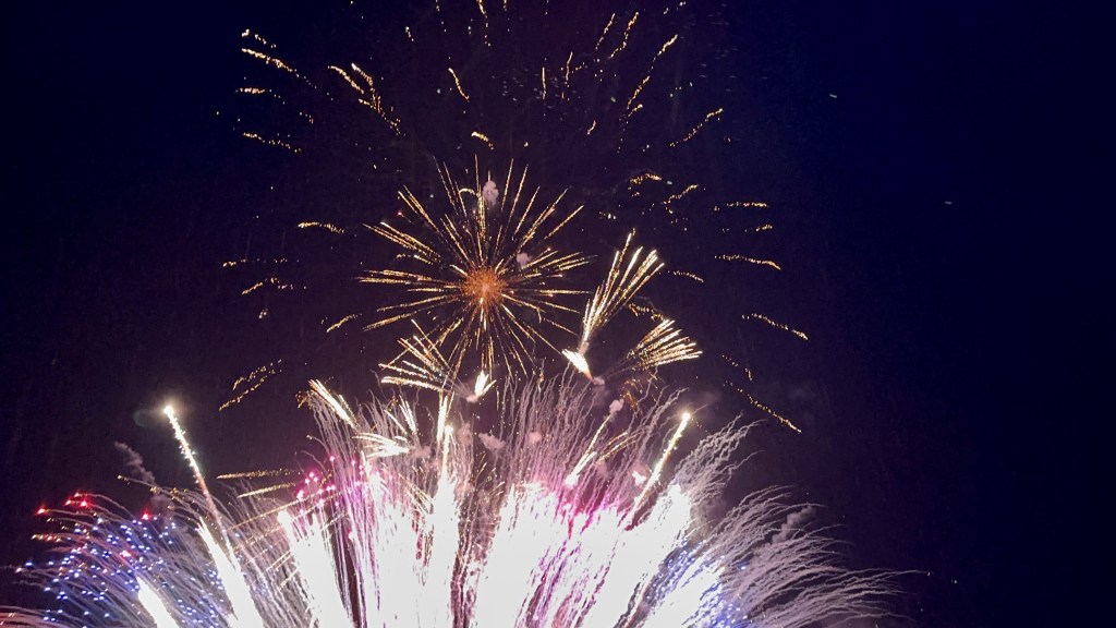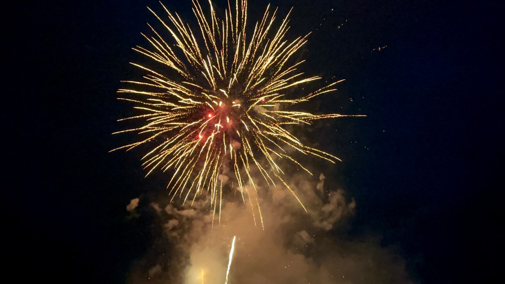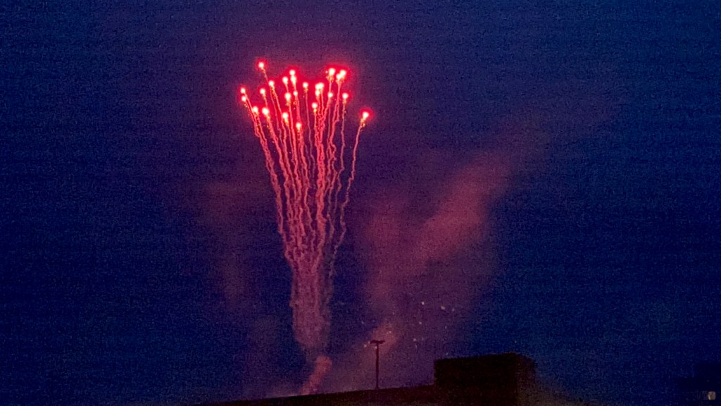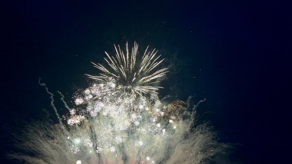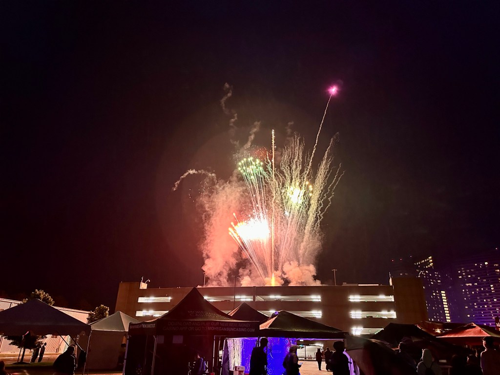 It started raining a bit around 8:45 p.m. The fireworks were suppose to start at 9:15 p.m. The casino began them early. The decision was a good one.