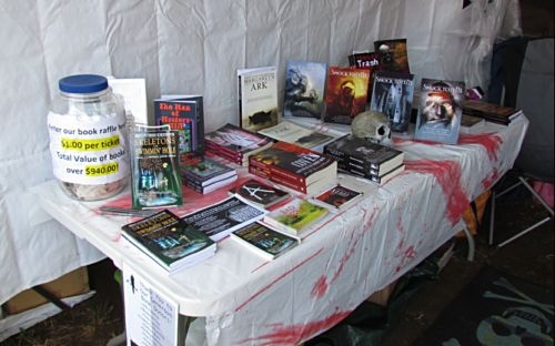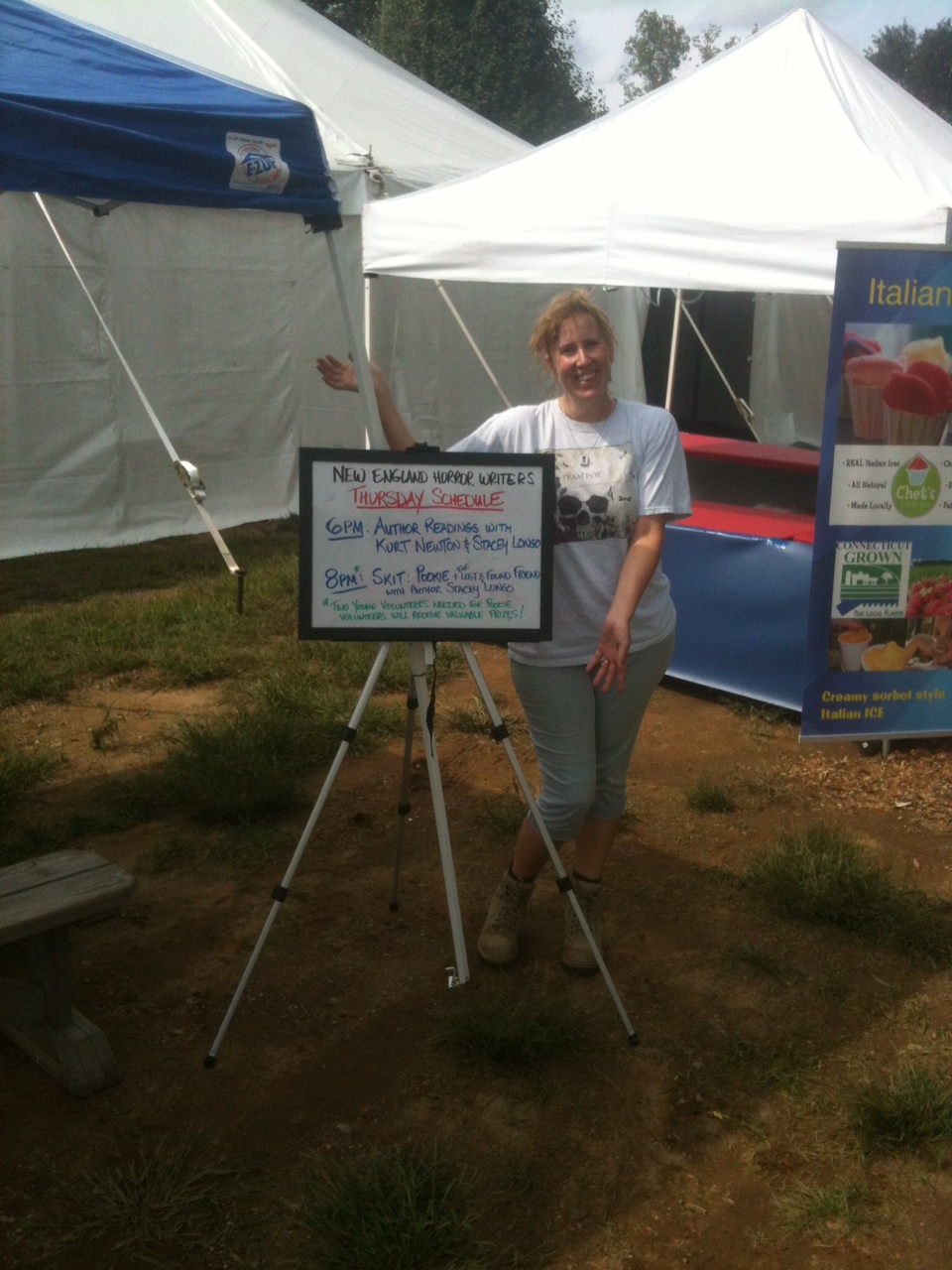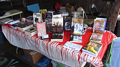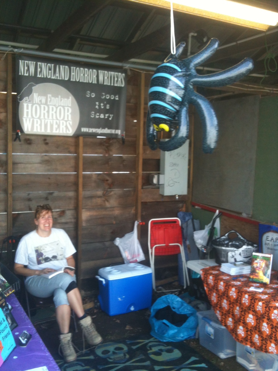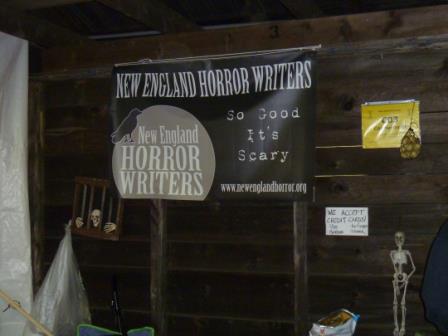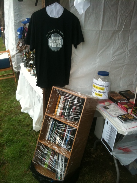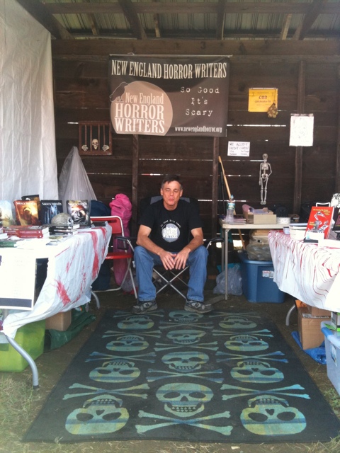 It began innocently enough. I arrived Thursday afternoon and, after slogging through the rain-soaked hayfield turned parking lot turned mud pit, I was greeted by Jason Harris at the gate. Jason was wearing his black New England Horror Writer’s t-shirt. I’d met Jason before and it was nice to see a familiar face among the Lion’s Club and John Deere logo wearing locals. Jason led me to the NEHW booth and I was pleasantly surprised by the look and location of our humble home away from home.