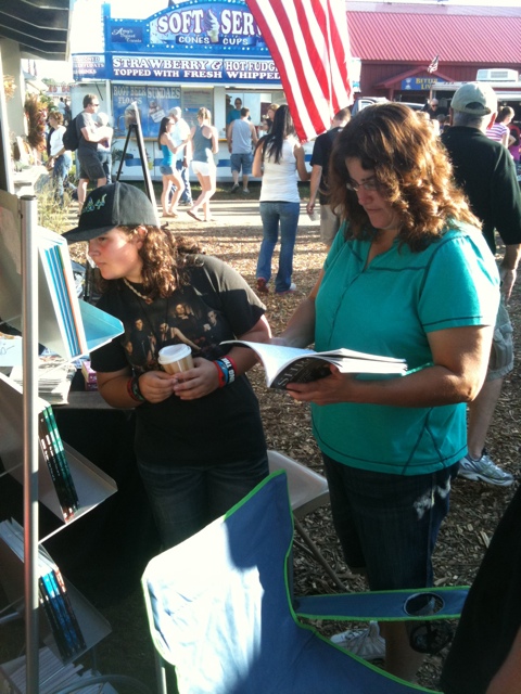 I arrived before noon. Jason and Stacey, and Kristi and Nathan were there. Although Jason and Stacey looked tired, there was a renewed excitement in the air. I was told Saturday was a success. Many books were sold. A good time was had by all. Today was the day of the big country music concert, so the crowds were expected to be big. Jason was hoping we’d finish on a high note, so to speak.
