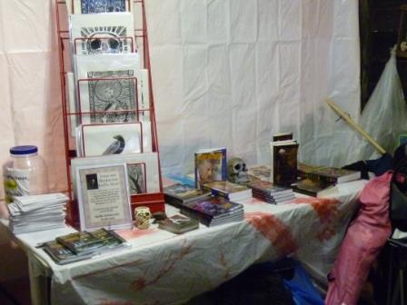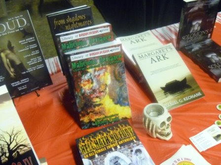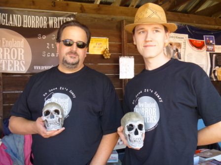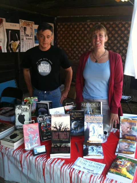 NEHW member books were neatly displayed across two long tables. A custom made banner hung at the back of the booth proudly displaying our organization’s logo. Skeletons dangled on the walls and skulls rested on the tables, so there was no mistaking what kind of books we were selling. Jason’s better half, Stacey Longo, was there. Both Jason and Stacey were not only glad to see me, each simmered with that nervous excitement that is only found among couples expecting their first child.