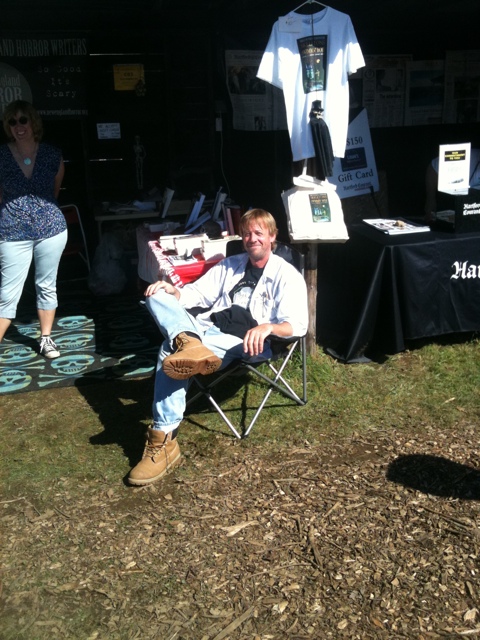 One woman came into the booth, all smiles, after I had handed her one of the ghost stories. She made a beeline for the table. “Oh my God! Is this the Disney book? [referring to Skeletons in the Swimmin’ Hole]. I saw this in the paper and I can’t believe I found it!” She just grinned and grinned (and I have to admit I had never seen anyone react that way to my book, so I felt a little strange) and when Ken teased her about “Hey, great, now she isn’t going to get one of mine,” she said, “You write, too?” (She was referring to Shock Totem). “Well,” Ken said, “I’m the editor.” She wasn’t fazed. “I’ll get one, which issue do you think I would like?” (I can’t remember if she wanted him to sign it or not, but I seem to recall she did. Ken can correct me). When I went to go get a cup of coffee, I passed one man sitting on a rock, reading. He had a copy of Kurt Newton’s Life Amongthe Dream Merchants and Other Phantasies. I had seen him at the booth with the book in his hands, and then when he realized Kurt was actually standing there, it was like he had won the lottery. Similar scenes played out with nearly all the writers who were there with their work.