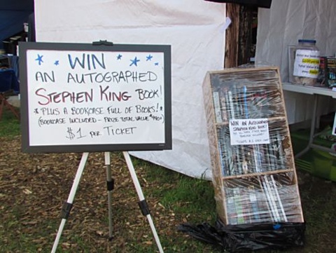 Like I said, it began innocently enough. First night highlights: I got to hang out with Dan Keohane (author of Solomon’s Grave & Margaret’s Ark); I sold one book; I ate some really good Pad Thai noodles and garlic chicken on a stick; and no rain. Lowlights: I had brought my new 30x zoom digital camera with me, but when I went to use it the battery pack was dead; the grassy lane outside our booth was a bit muddy and woodchips had to be laid down to make it passable for foot traffic; and it got a little chilly once the sun had set. Overall, a good start to what I hoped would be a fruitful weekend.