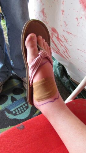 The fair was in full swing and no sooner had I arrived, Kristi, wearing low-cut shoes, had had a little accident involving an extra-long and extra-sharp woodchip. Apparently, the chip had flipped up and stabbed her in the ankle, taking a little gouge out of her skin. To me, it looked like a relatively harmless injury, one that a wipe with a damp paper towel would fix. But, no, Kristi was beside herself. Infection, even cellulitis was mentioned. Nathan eased her fears by taking her to the First-Aid center. I thought it was an over-reaction. But little did I know.