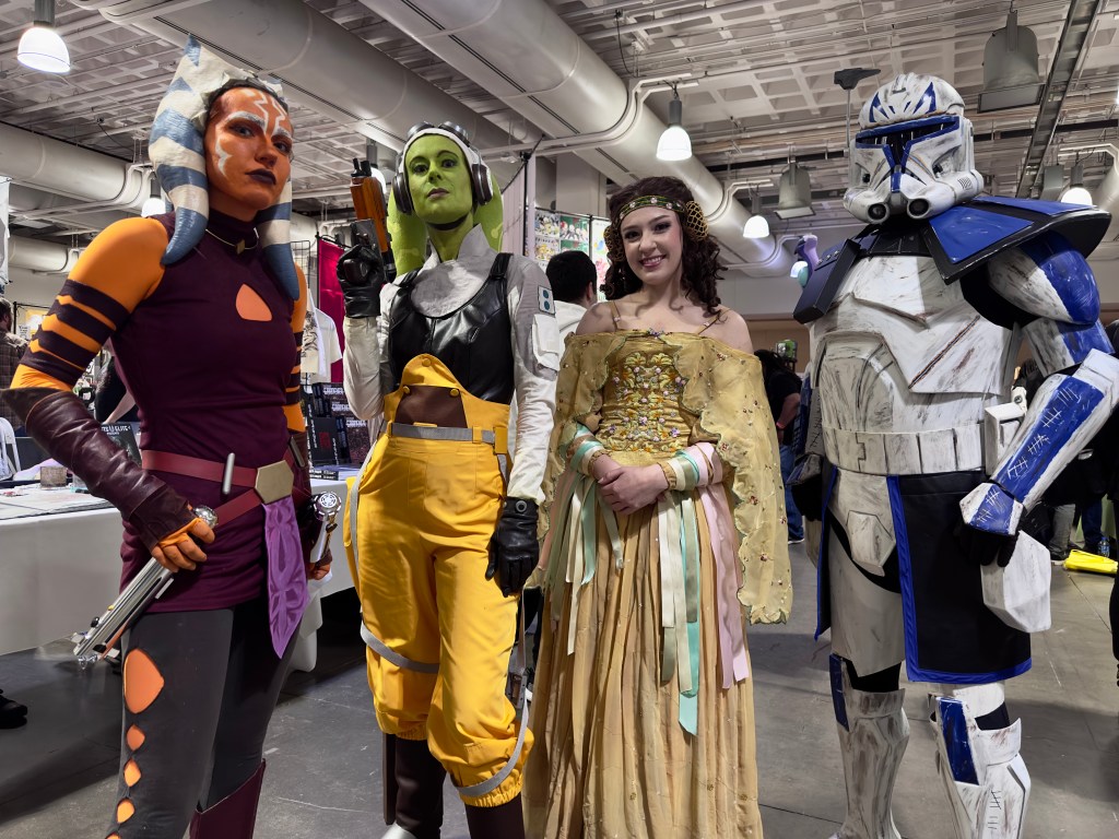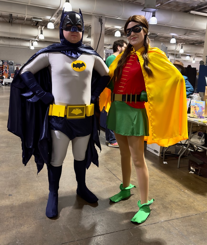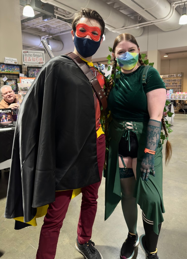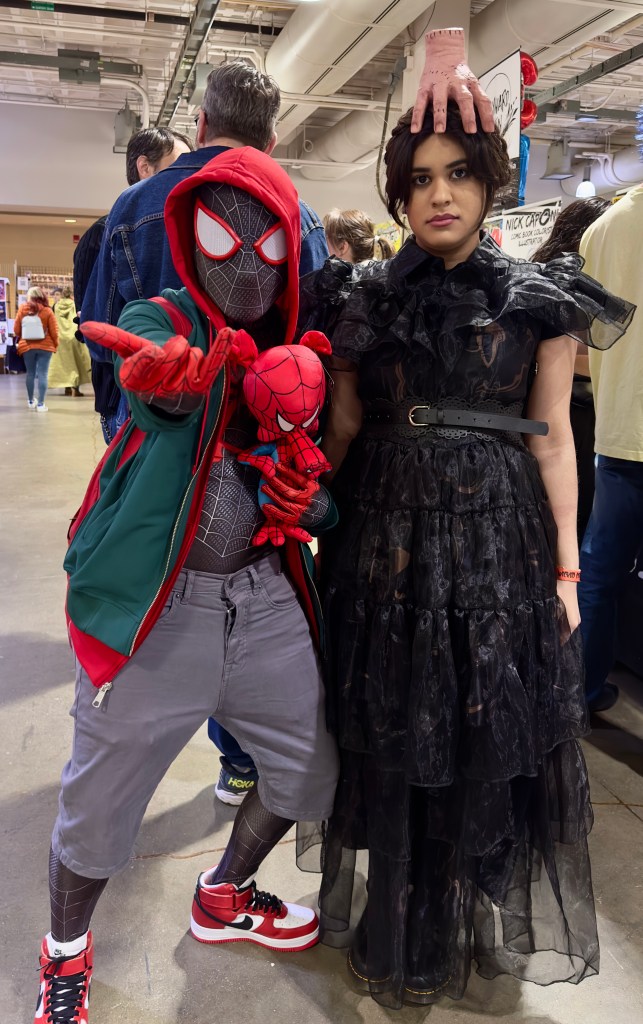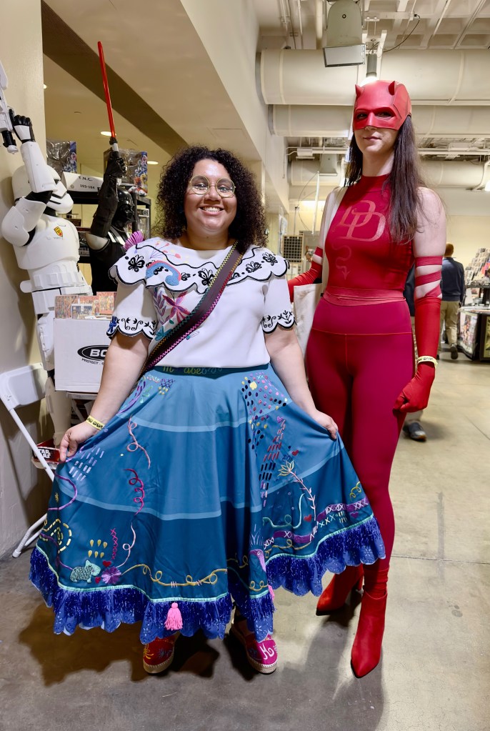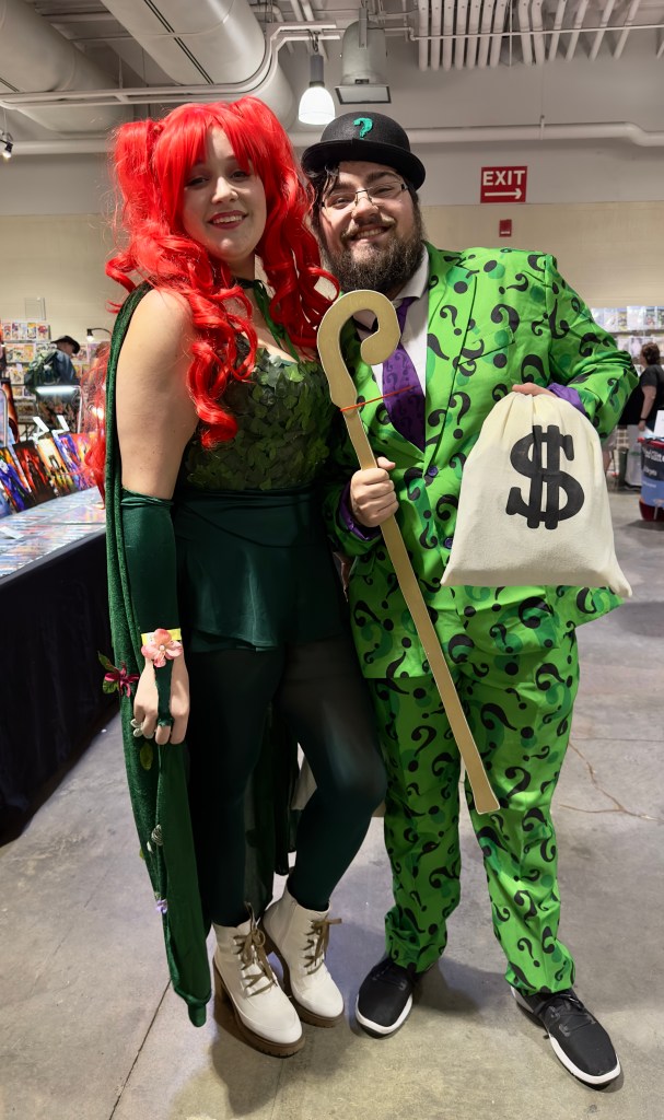 Mirabel and Daredevil. Spider-man and Wednesday Addams. Rogue, Wonder Woman, Scarlet Witch, and The Punisher. The Predator and a Bounty Hunter. Author Christopher Paniccia. Tik-tok. Wizards. The Mandolorian. Batman and Robin. Poison Ivy and the Riddler.