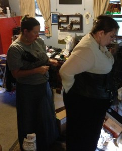 Author Kristi Petersen Schoonover helps fellow author Trisha Wooldridge with her corset for Rock and Shock. Photo by Jason Harris.