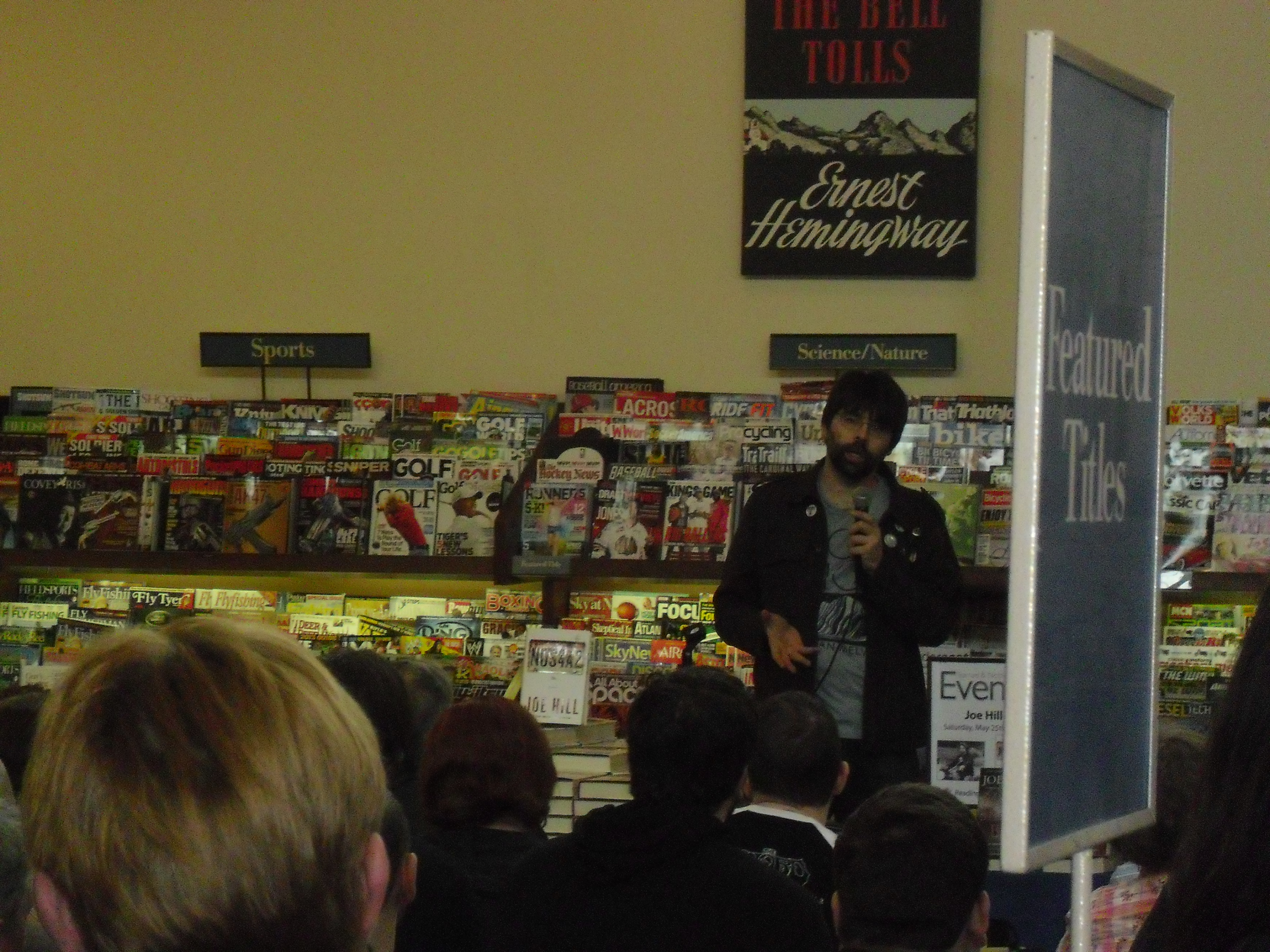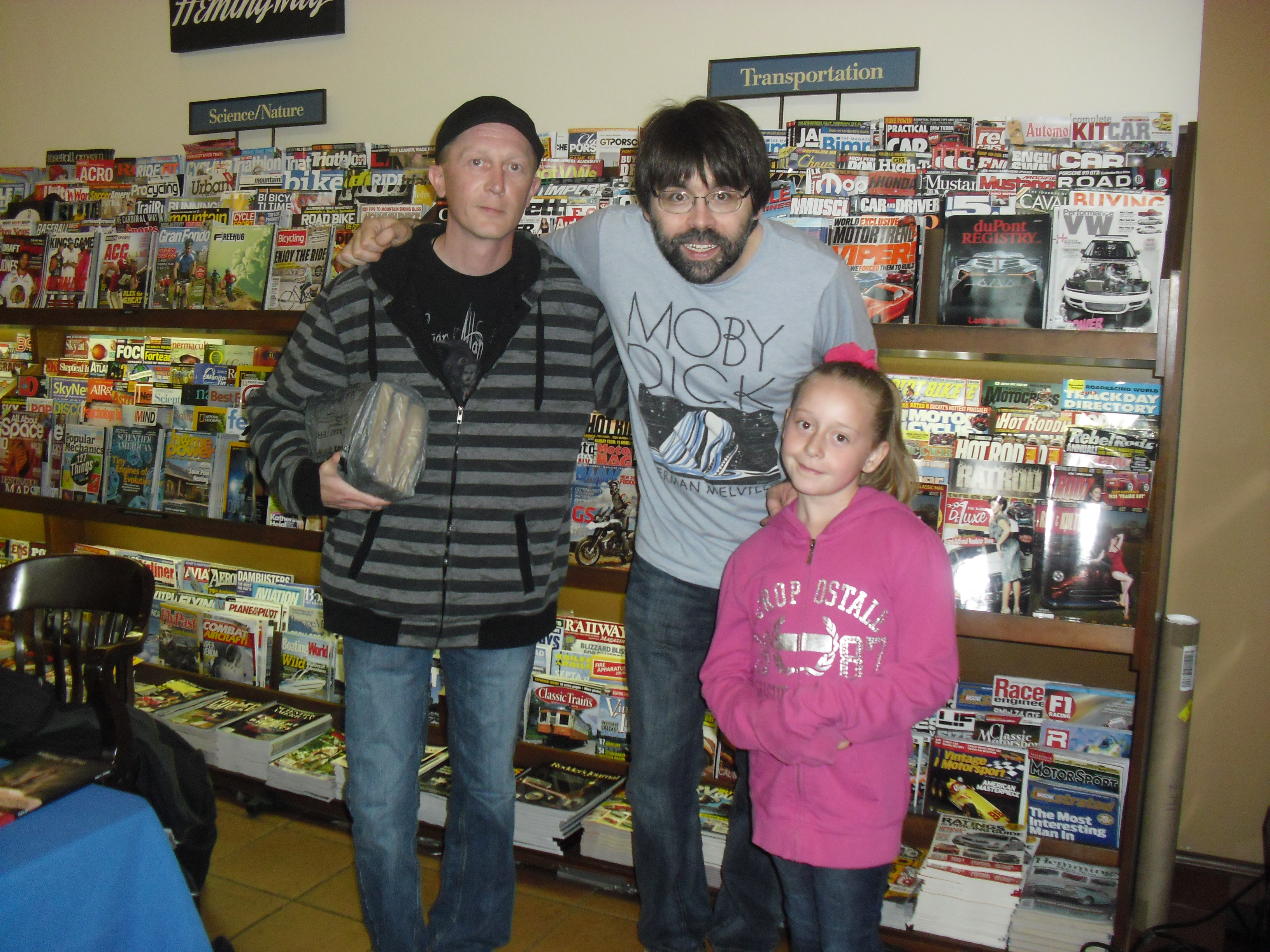My nickname should really start to become “Tardy Tim” because I am late for everything recently. We got to the event around 2:30 (half an hour late) and missed the reading part of the event. There was a huge crowd all encompassing the magazine section of the store. My daughter and I snuck in the back, right beside fellow Necon camper Gardner Goldsmith (SHOUTOUT).