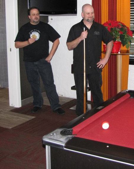 From left to right: Scott Goudsward and David Price playing pool (picture courtesy of John M. McIlveen)